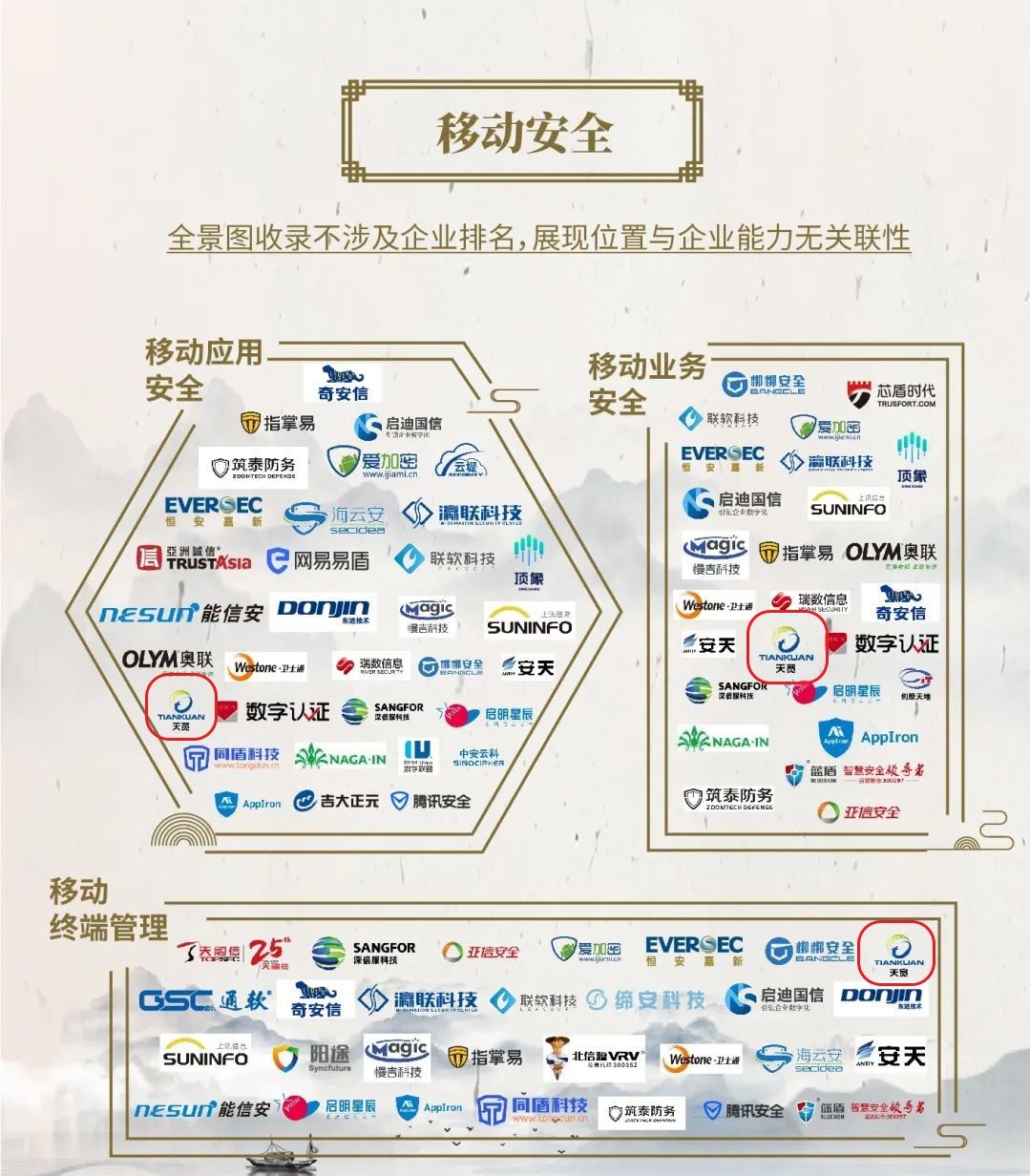 近日,一(yī)年(nián)一(yī)度的安全牛第八版中國(guó)网络安全行(xíng)业全景图正式发布。天宽凭借产品技術(shù)研发创新、良好的业务表现及市场反馈等综合优势入围數(shù)据安全、物(wù)联网安全、移动安全、安全服务4大类一(yī)级安全领域,在文档安全、其他(tā)物(wù)联网安全、移动应用安全、移动业务安全、移动终端管理、安全集成等6个细分领域榜上(shàng)有名。能(néng)够在去年(nián)入围的基础上(shàng)再新增文档安全和(hé)其他(tā)物(wù)联网安全2个细分领域,是天宽在网络安全领域良好发展态势的体现,更是对天宽多年(nián)来研发实力和(hé)服务能(néng)力的认可(kě)。