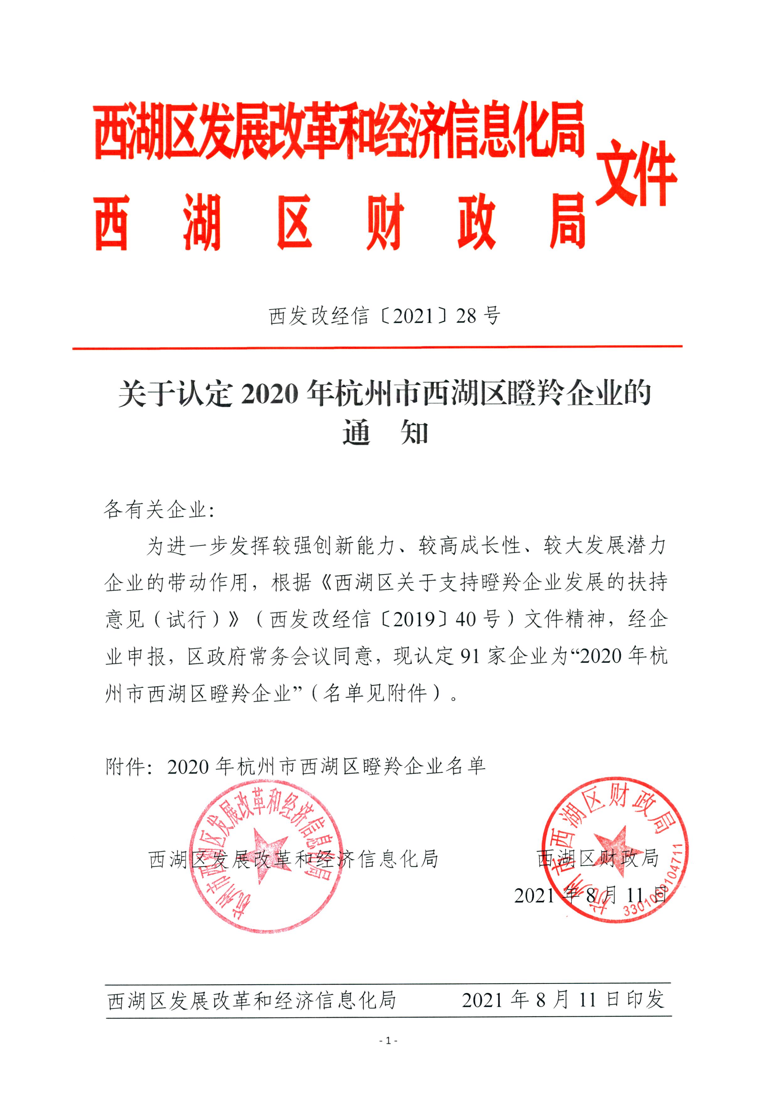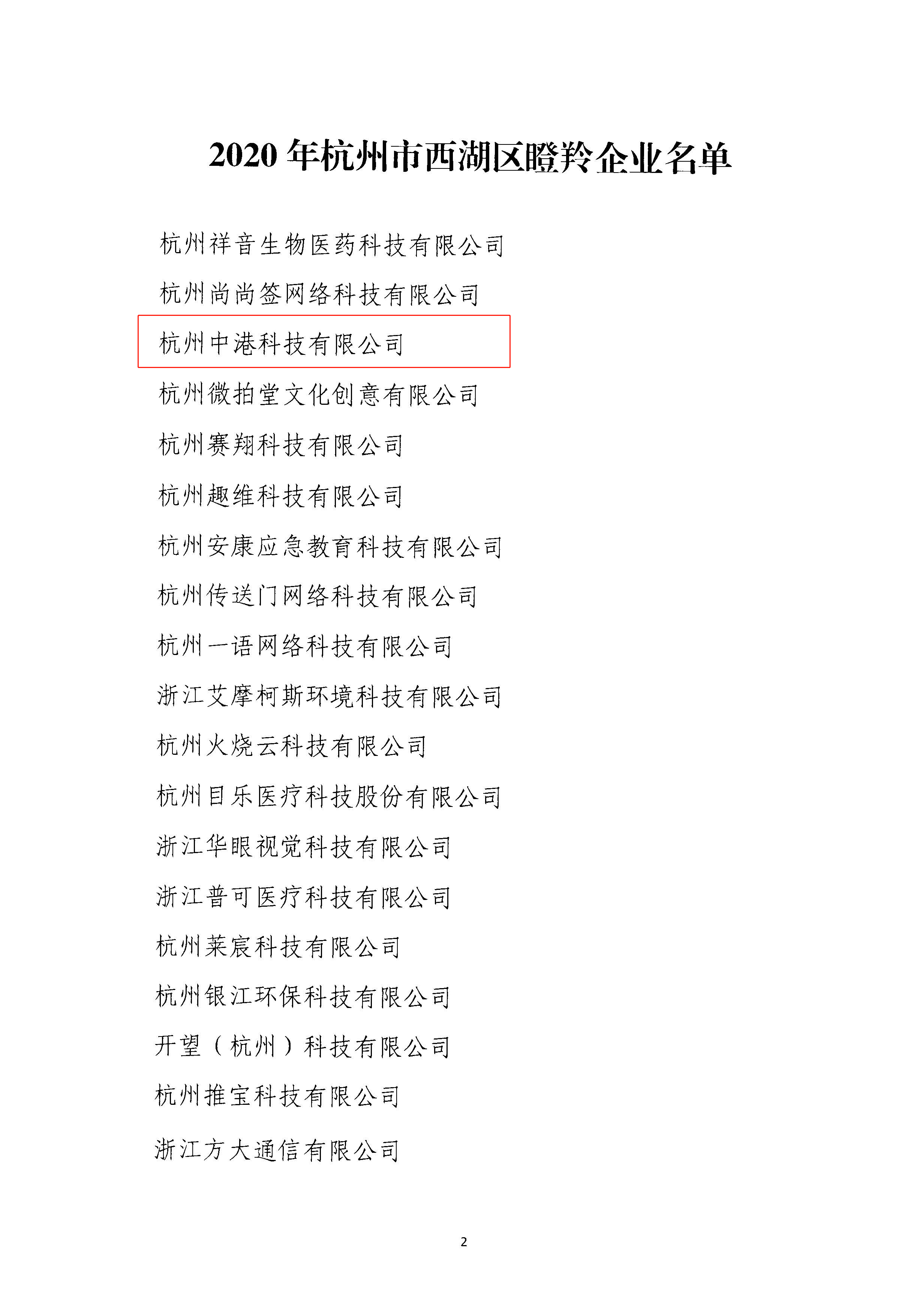 荣誉|中港获“2020年(nián)杭州市西(xī)湖區(qū)瞪羚企业”称号
