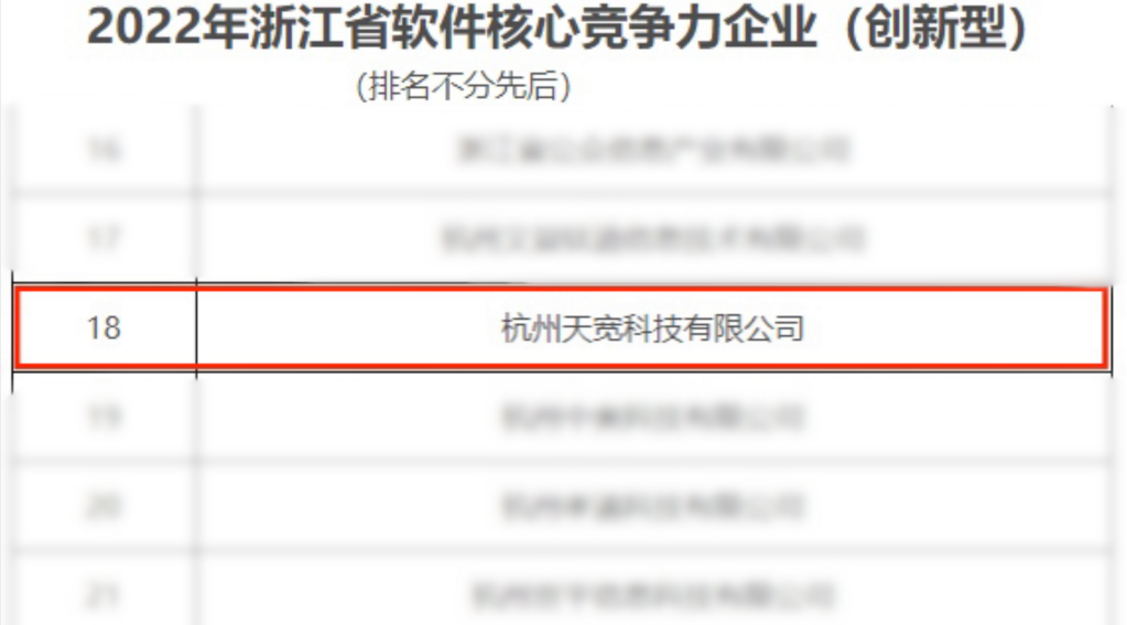 近日,浙江省软件行(xíng)业协会公布了(le)2022年(nián)浙江省软件企业核心竞争力评价结果公示名单。杭州天宽科技有限公司凭借行(xíng)业领先的专业自(zì)研能(néng)力和(hé)深厚的产品、项目经验,成功入选“2022年(nián)浙江省软件核心竞争力企业(创新型)”。