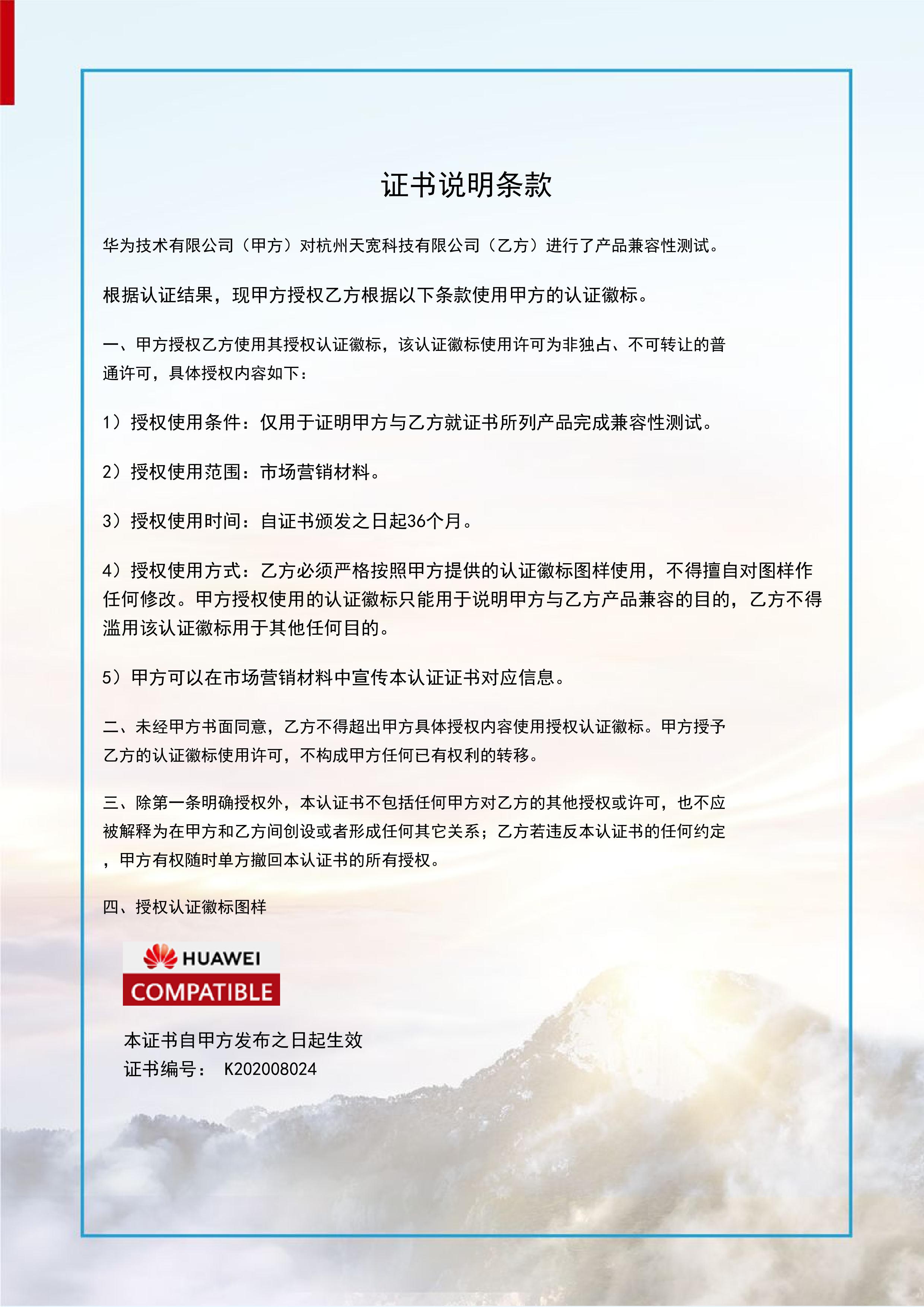 深化合作(zuò)丨天宽荣获华為(wèi)compatible技術(shù)认证