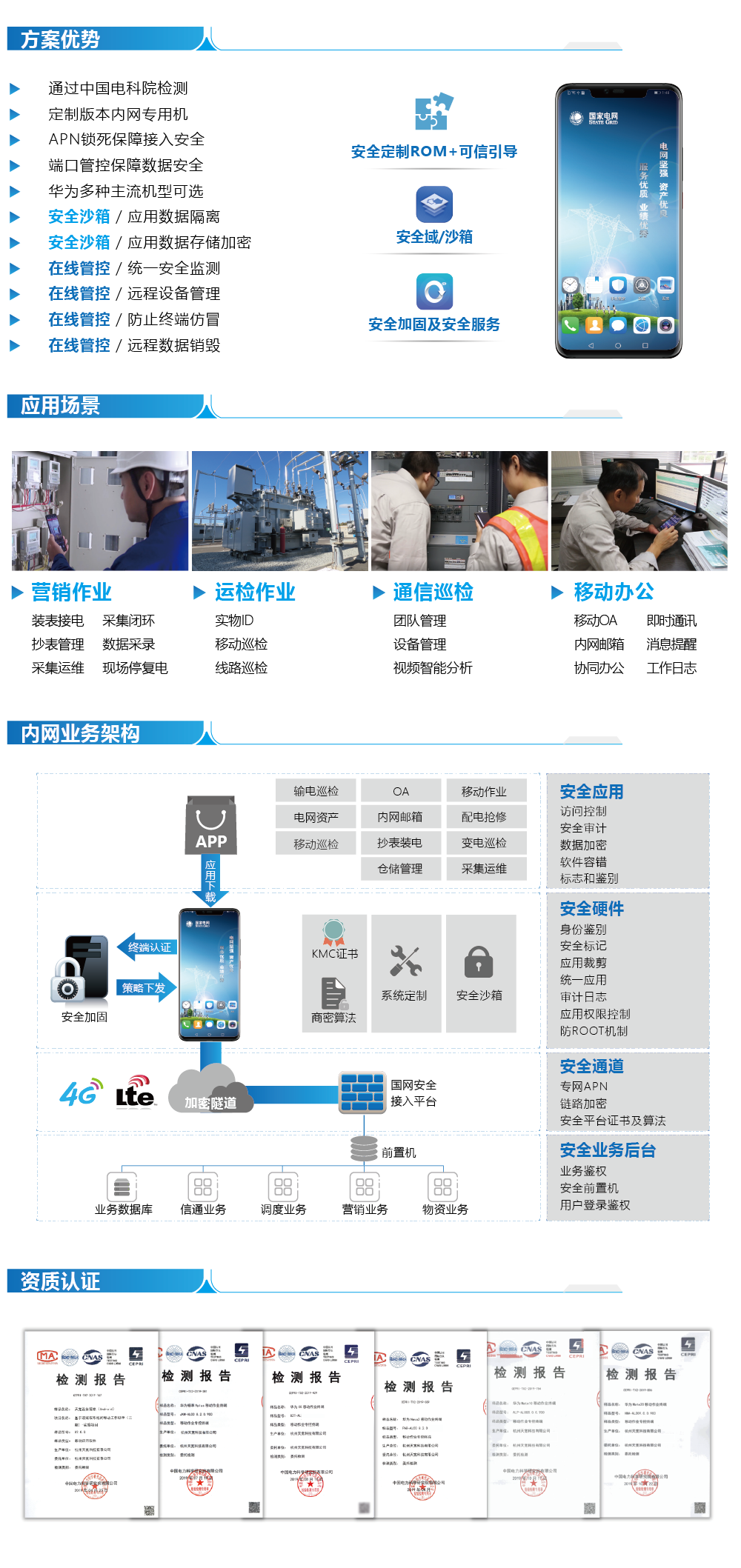 电力內(nèi)网移动作(zuò)业安全终端——以华為(wèi)主流商用手机、平板為(wèi)载体,深度定制电力版ROM,為(wèi)电力用户提供內(nèi)网移动作(zuò)业安全终端。产品可(kě)实现安全登录、防刷机、防root、应用裁剪、安装源限制、安全审计、插件安全等功能(néng),满足安全管控及应用整合的需要(yào)。产品通(tōng)过中國(guó)电科院《移动作(zuò)业专控终端操作(zuò)系统(Android)安全测试规范》检测,契合國(guó)网互联网部440号文、前信通(tōng)网安110号文件政策指导要(yào)求,构建电力內(nèi)网移动作(zuò)业安全终端解决方案。
