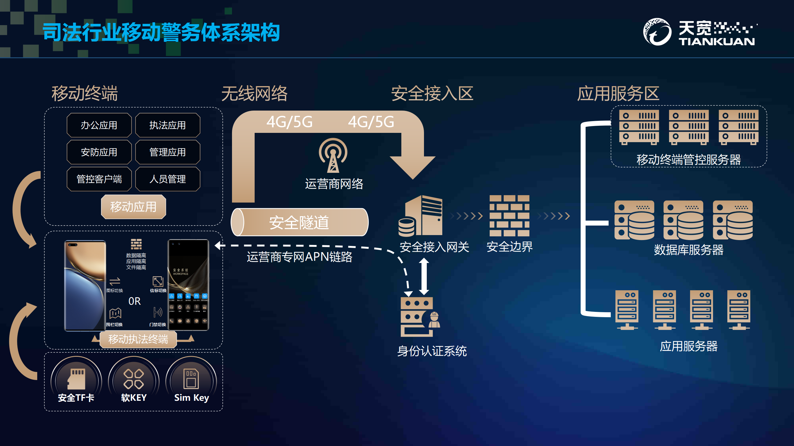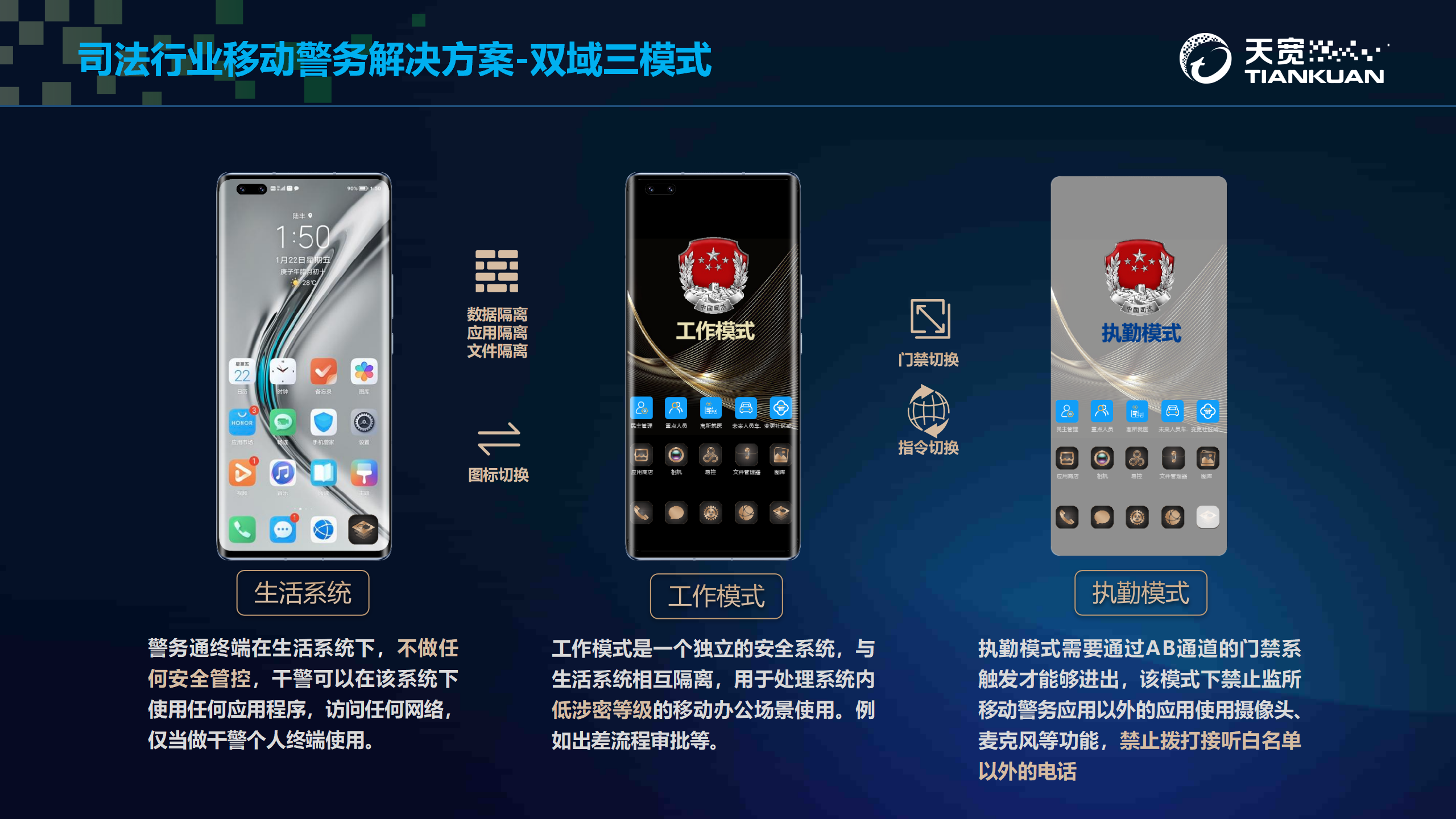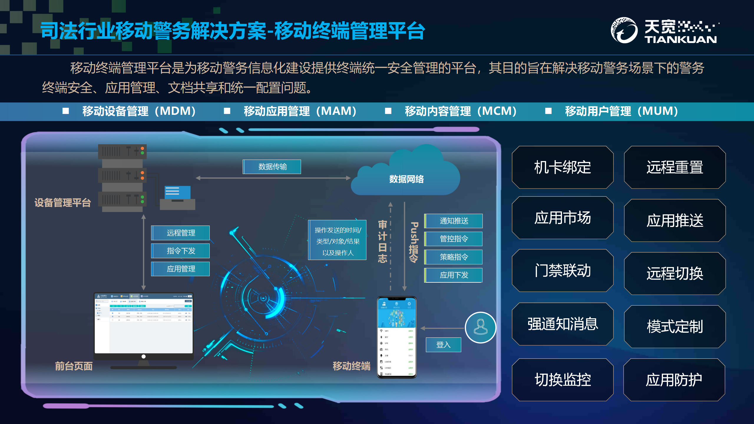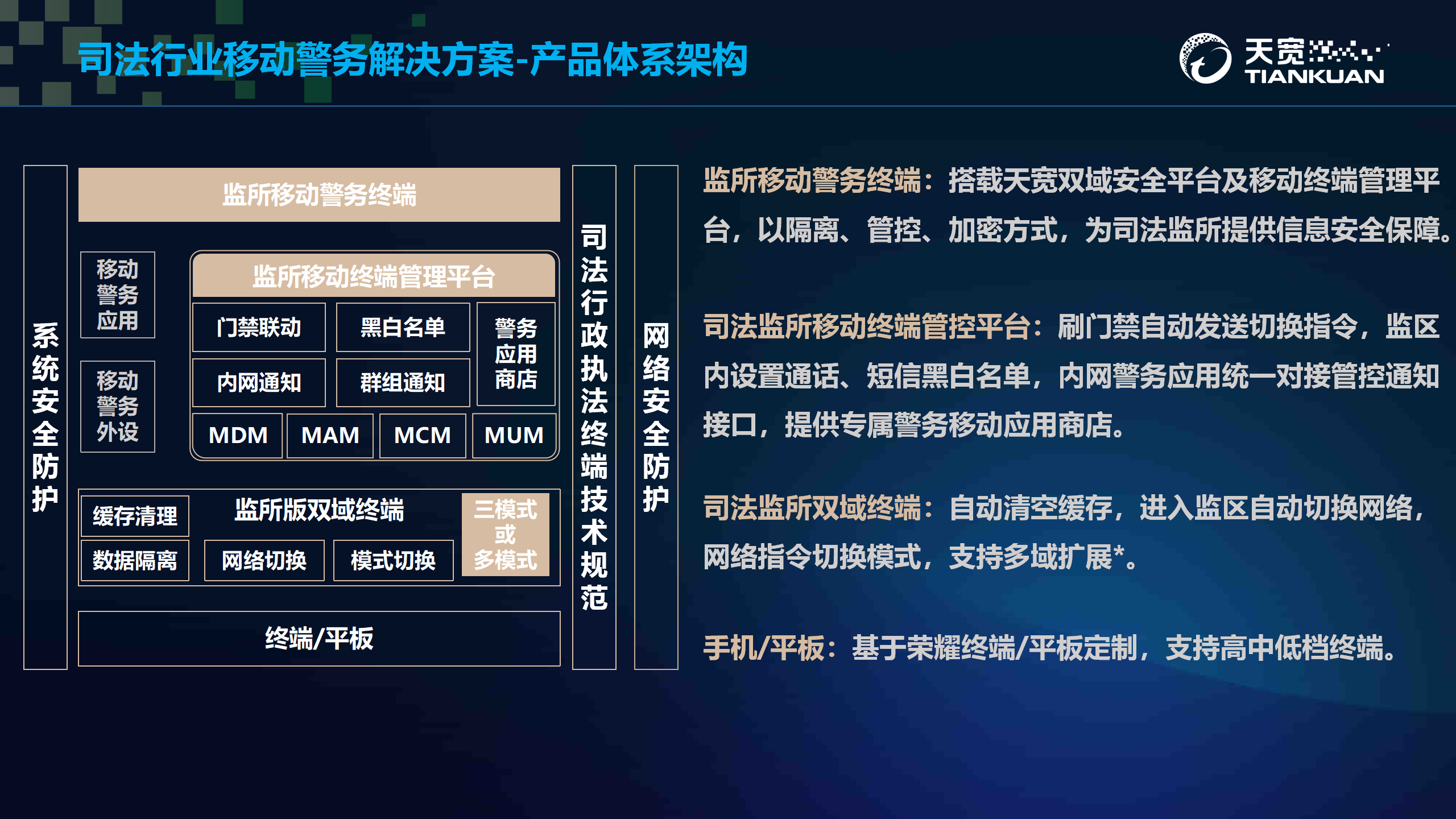 移动终端管理平台是為(wèi)移动警务信息化建设提供终端统一(yī)安全管理的平台,其目的旨在解决移动警务场景下(xià)的警务终端安全、应用管理、文档共享和(hé)统一(yī)配置問(wèn)题。搭配使用搭载天宽双域安全平台的制定智能(néng)终端,以隔离、管控、加密方式,在确保數(shù)据安全,防止涉密信息泄露的基础上(shàng),实现办公移动化,增强司法管理工(gōng)作(zuò)机动性,实现管理“智慧化”,提高管理运营水平。