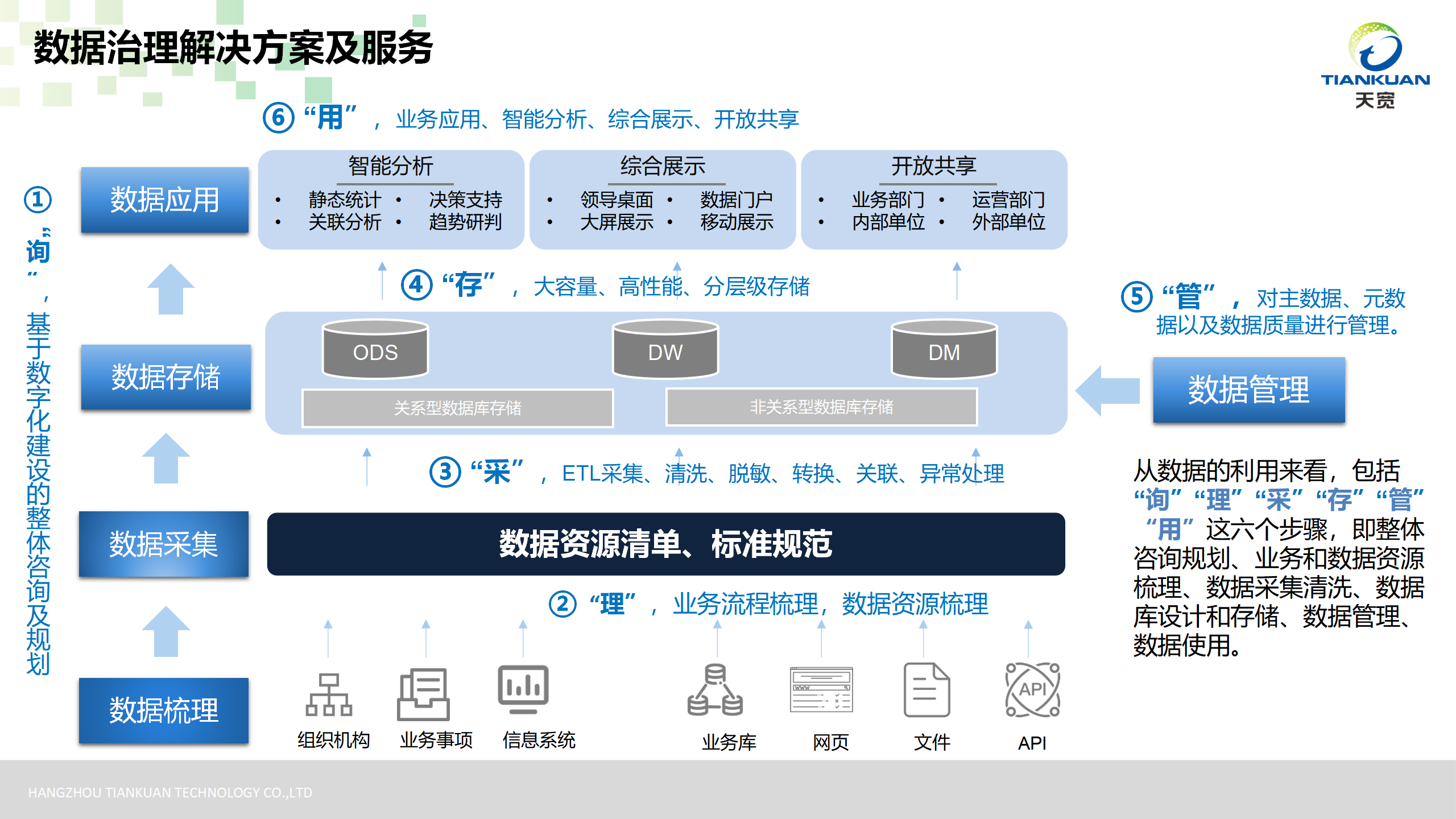 從(cóng)數(shù)据“询”、“理”、“采”、“存”、“管”、“用”六个步骤出发,提供整体咨询规划、业务和(hé)數(shù)据资源梳理、數(shù)据采集清洗、數(shù)据库设计和(hé)存储、數(shù)据管理、數(shù)据使用等數(shù)据治理解决方案及服务,帮助客户更有效地(dì)管理其數(shù)据资产,确保數(shù)据的质量和(hé)安全,并支持數(shù)据驱动的决策和(hé)创新。